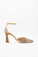 Zapato cerrado en punta en terciopelo color avellana, un tono cálido, neutro y elegante. Su diseño con pulsera...