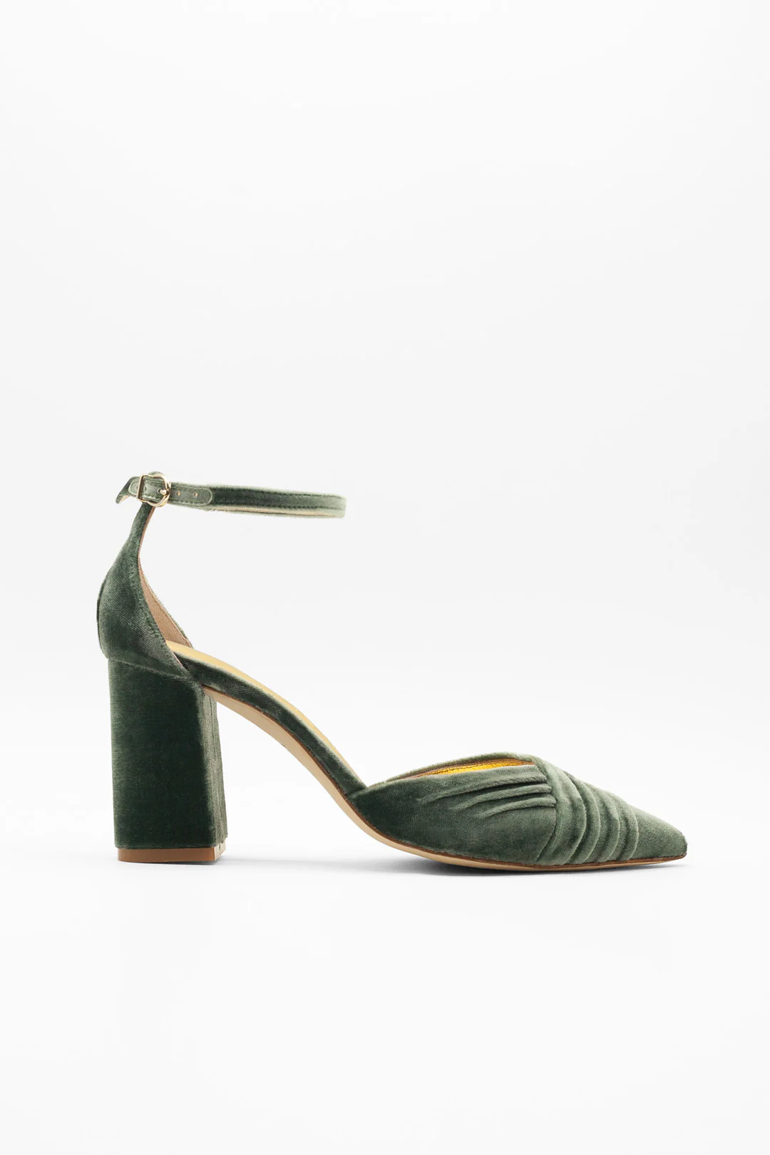 Zapatos de punta elegantes de terciopelo de seda y tacón cómodo bloque de 8 cm.